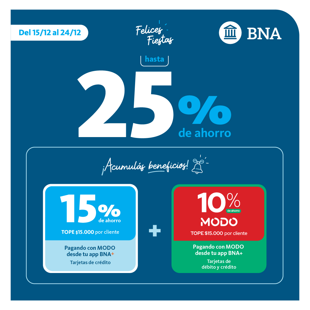 Estas Fiestas, obtené hasta un 25% de ahorro pagando con MODO desde la app BNA. ¡Vení y descubrí los locales adheridos para armar tus regalos de navidad!