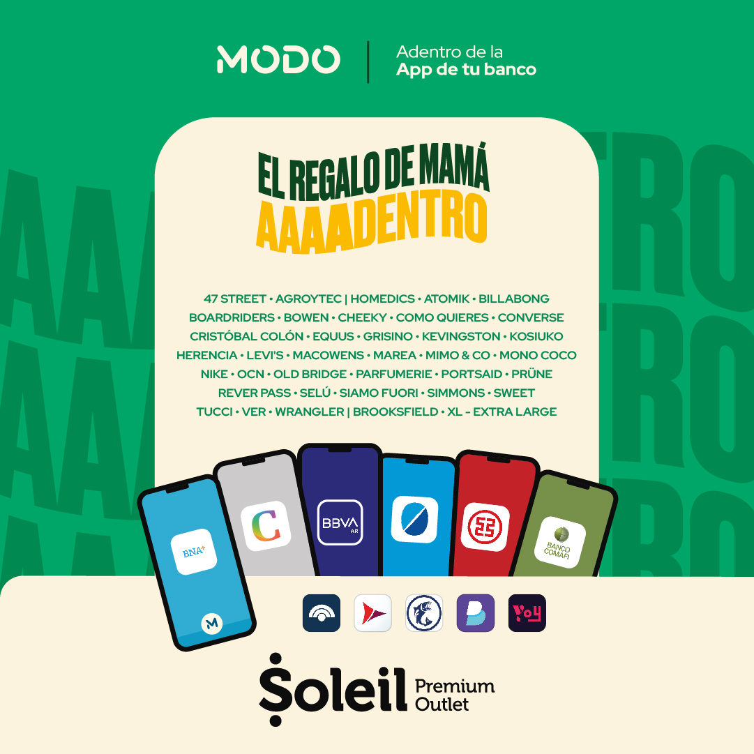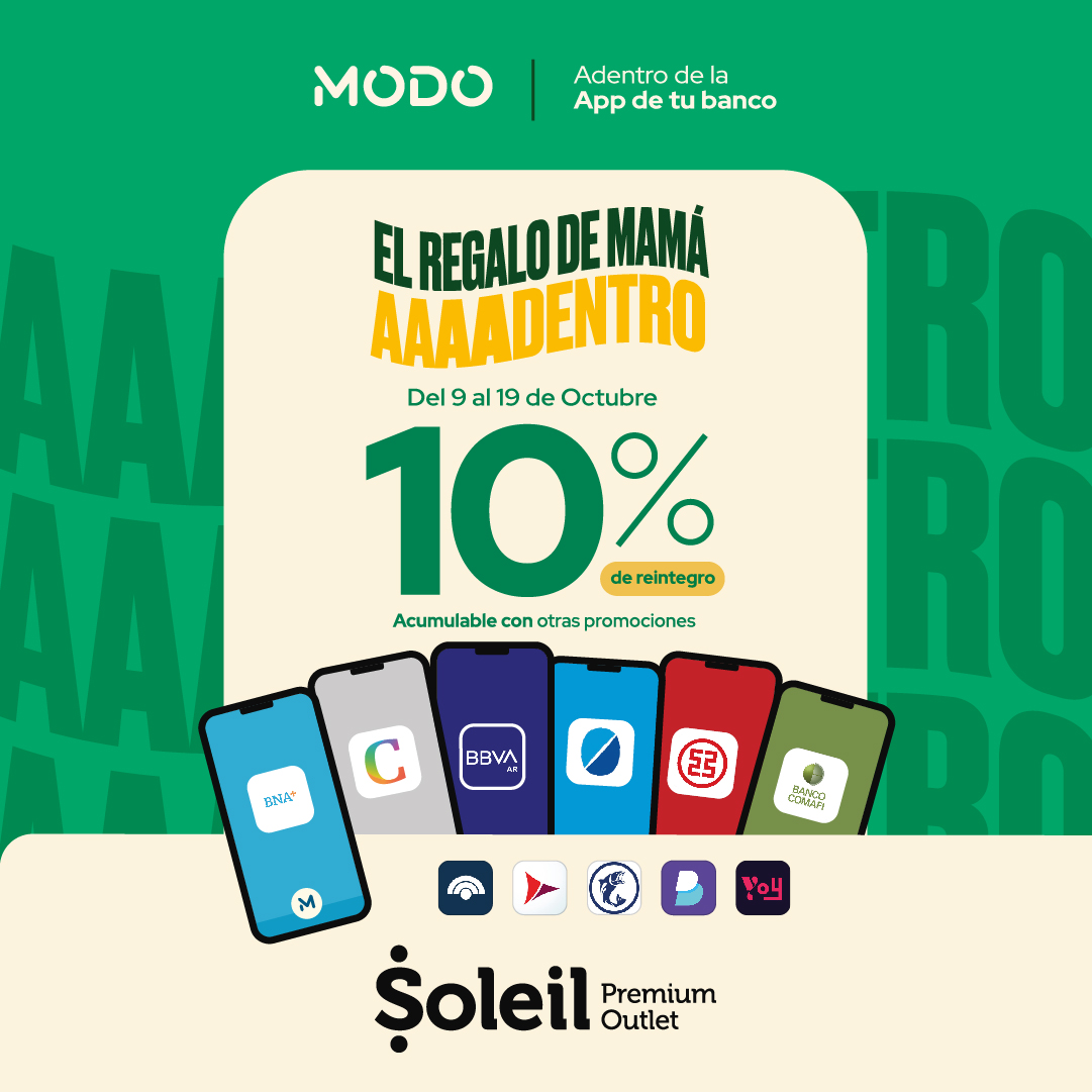Del 9 al 19 de octubre, aprovechá un 10% de reintegro pagando con MODO desde la app de tu banco en marcas adheridas ¡Aprovechá los mejores descuentos y sorprendela a mamá con el mejor regalo!