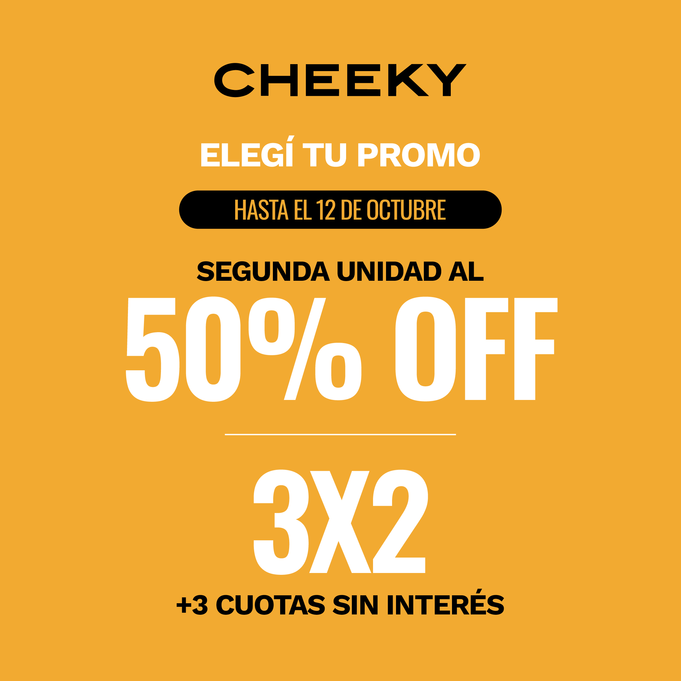 PROMOCIÓN VÁLIDA DESDE EL 09/10/2025 AL 12/10/2025. PARTICIPAN TODOS LOS ARTÍCULOS CUYOS CÓDIGOS COMIENZAN CON V26 Y TERMINAN EN 1 Y 2. NO PARTICIPAN ARTÍCULOS CUYOS CÓDIGOS COMIENZAN CON CHK Y TERMINAN EN 1, ARTÍCULOS REMANENTES Y LENTES. NO ACUMULABLE CON OTRAS PROMOCIONES VIGENTES Y/O CONCLUIDAS. CAMBIOS A 30 DÍAS POR PRODUCTOS PARTICIPANTES AL VALOR ACTUAL VIGENTE. VÁLIDO ÚNICAMENTE EN TODOS LOS LOCALES CHEEKY DE LA REPÚBLICA ARGENTINA. CONSULTAR DIRECCIONES EN WWW.CHEEKY.COM.AR O AL +54 91 169578303 (LINEA WHATSAPP). GRUPO ALTATEX. GENERAL PACHECO 1920, DON TORCUATO, BUENOS AIRES.