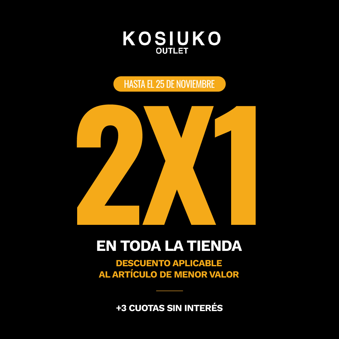 PROMOCIÓN VÁLIDA EN EL LOCAL KOSIUKO OUTLET ubicado en SOLEIL OUTLET Y DISTRITO ARCOS . Desde el 19/11/25 al 25/11/25 inclusive . TODO KSK Y HERENCIA AL 2X1. Descuento aplicable al art de menor valor. NO acumulable con otras promociones vigentes en el local ni bancarias. 3 cuotas sin interes. para cambios se toman los art al valor abonado. SÓLO PARA COMPRAS. VALIDO CON TODOS LOS MEDIOS DE PAGO ACEPTADOS POR EL LOCAL. 3 CUOTAS SIN INTERES abonando con master, visa y american bancaria,.No Aplica a art con tag de Rebajas. PROMOCIÓN NO COMBINABLE NI ACUMULABLE CON OTRAS PROMOCIONES U OFERTAS VIGENTES .. NEW FAMILY CUIT 33-681345839 gurruchaga 950. caba