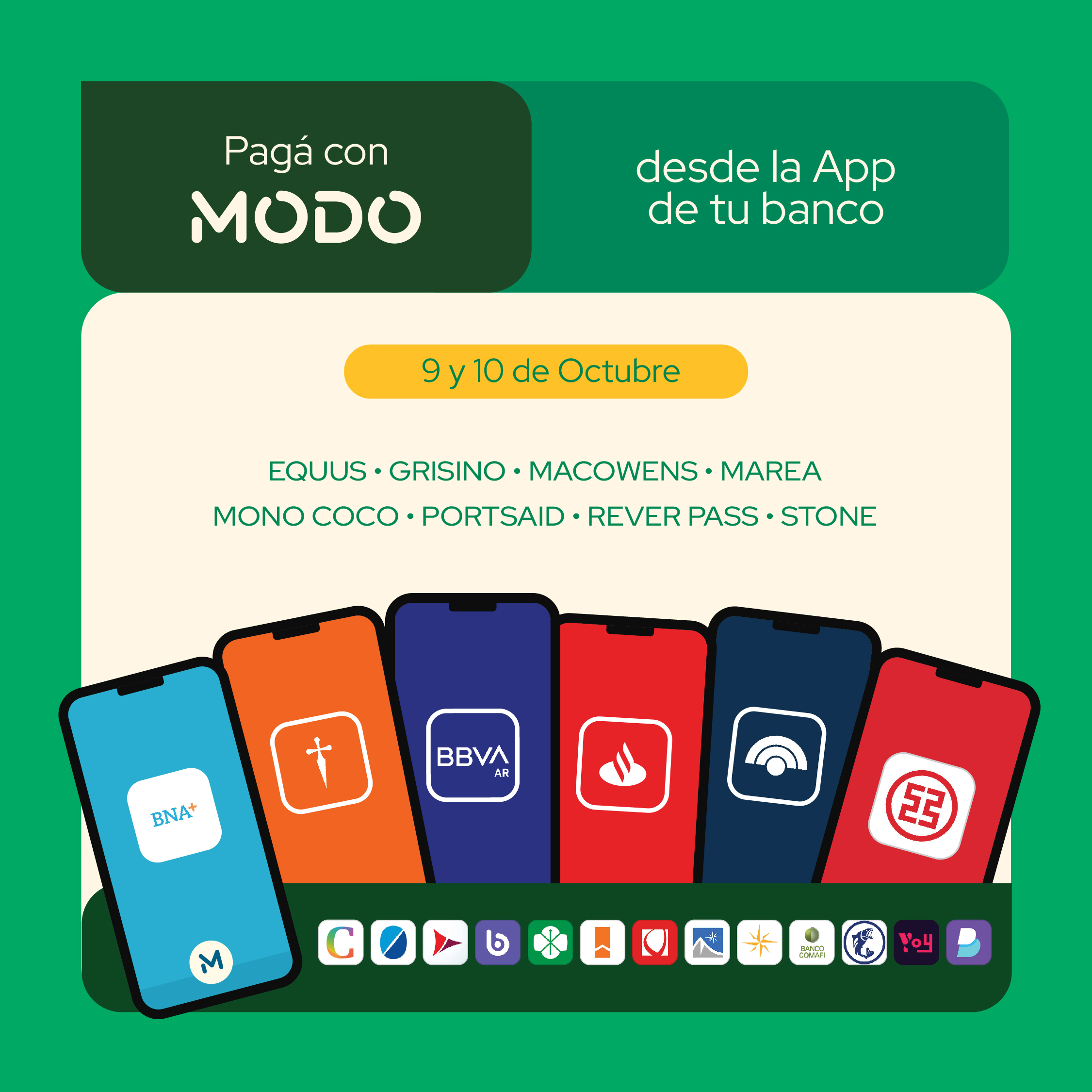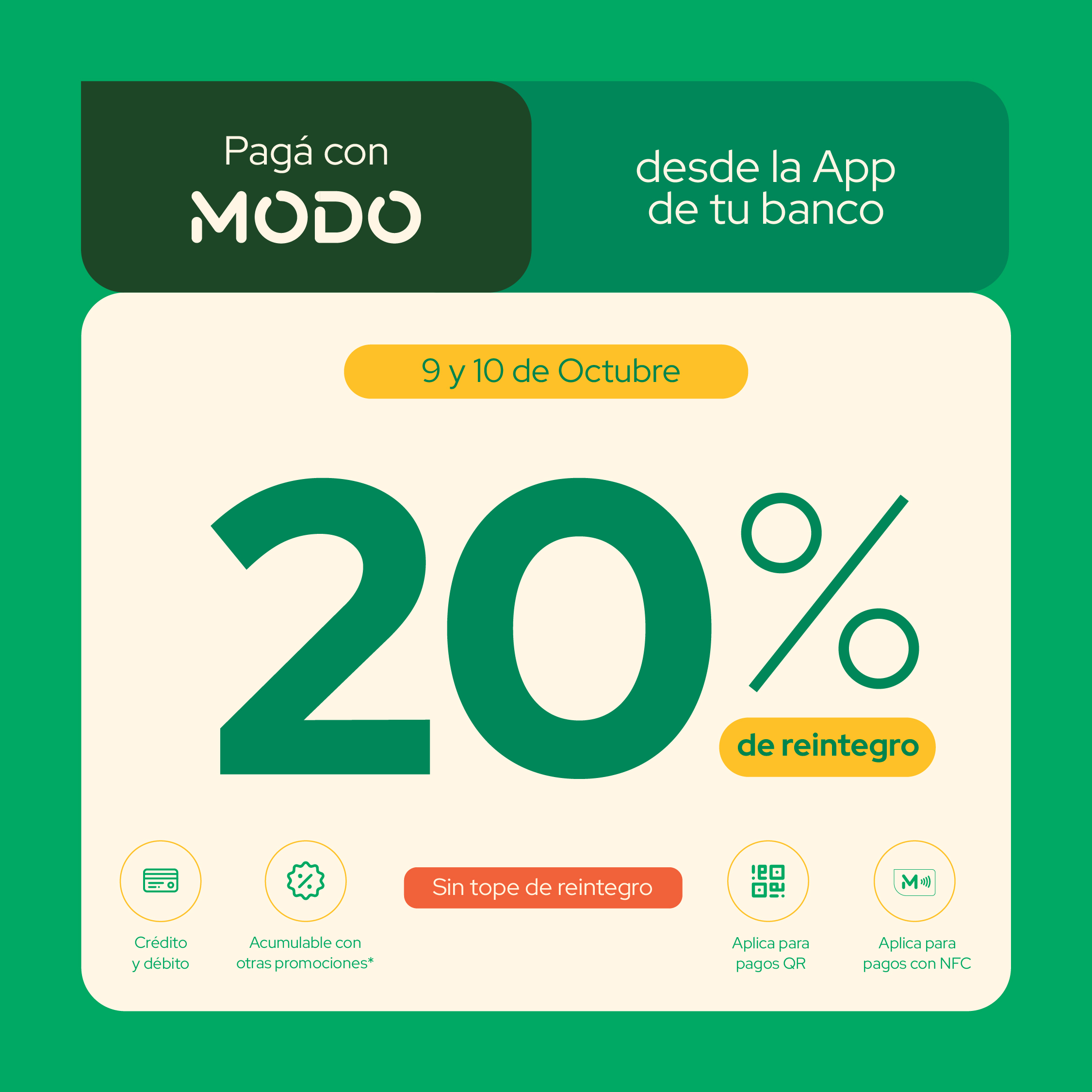 Este beneficio es acumulable con otras promociones vigentes que apliquen pagando con MODO. Sin tope de reintegro. El reintegro se acreditará únicamente a aquellos usuarios que sean titulares de una cuenta bancaria en la entidad emisora de la tarjeta con la que realizó el pago. No olvides asociarla si usas la app MODO. Válido para Argentina. Aplica para bancos y comercios adheridos. Play Digital S.A. (MODO), CUIT 30-71682943-6, Av. del Libertador 7208 3°, CABA. PARA MÁS INFORMACIÓN Y CONDICIONES O LIMITACIONES APLICABLES, CONSULTE EN www.modo.com.ar/promos. No aplica en compras online. MODO Contactless (NFC) disponible sólo en dispositivos Android.