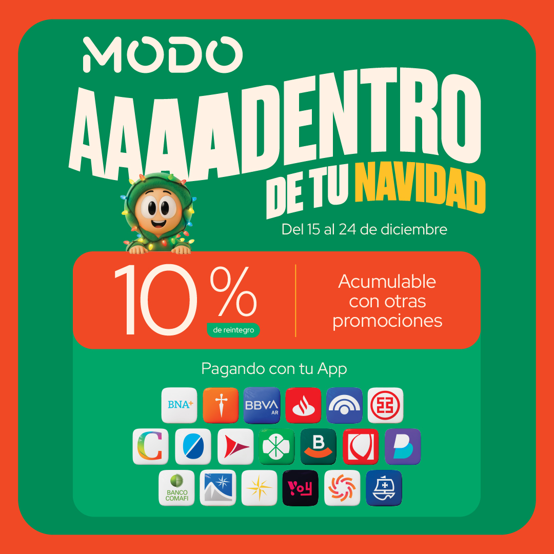 Tope de reintegro $15.000 por banco por promoción. Válido en Argentina del 15/12/2025 al 24/12/2025. Play Digital S.A., CUIT 30-71682943-6, Av. del Libertador 7208 3°, CABA. PARA MÁS INFORMACIÓN Y CONDICIONES O LIMITACIONES APLICABLES, CONSULTE EN www.modo.com.ar/promos.