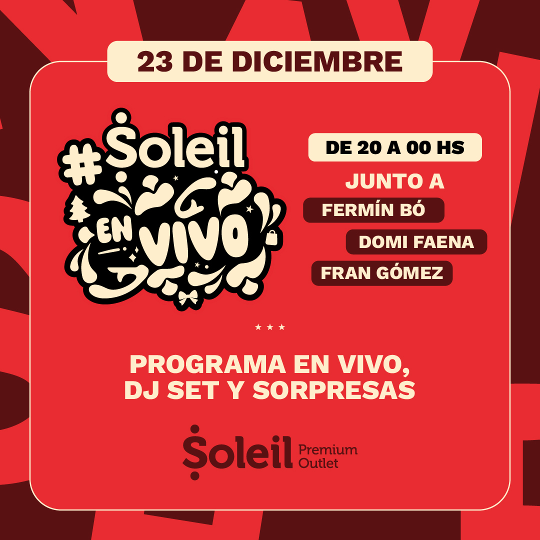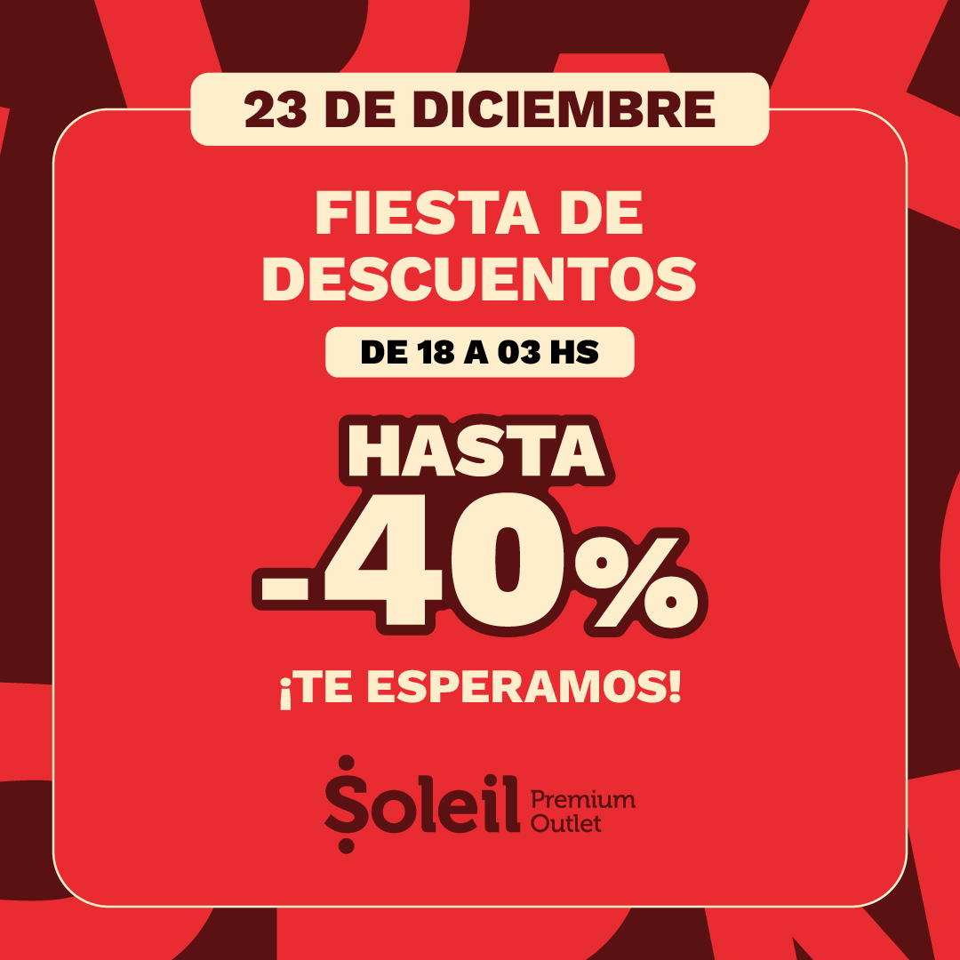 ¡FIESTA DE DESCUENTOS en Soleil! Este 23 de diciembre vení a Soleil y aprovechá hasta 40% off para que hagas los regalos de navidad. Además, vení a disfrutar de un programa en vivo, dj set, y muchas sorpresas más.