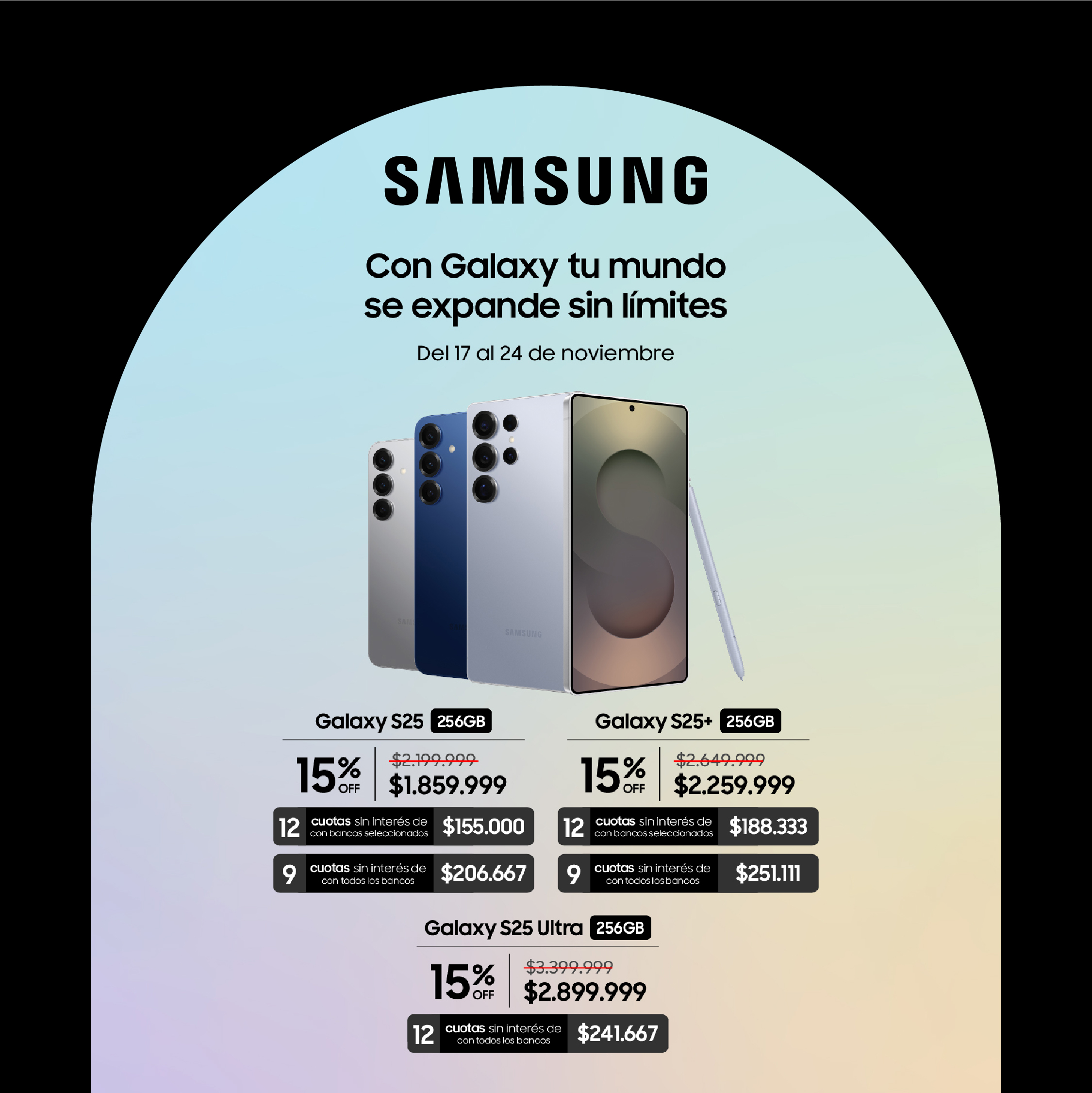 PROMOCIÓN VIGENTE DESDE EL 17/11/2025 AL 24/11/2025 O HASTA AGOTAR STOCK TOTAL DISPONIBLE EN LOS PUNTOS DE VENTA, LO QUE OCURRA PRIMERO. PROMOCIÓN VÁLIDA ÚNICAMENTE EN TIENDAS “SAMSUNG STORE”. HASTA 15% DE DESCUENTO EN CELULAR GALAXY S25 256GB (SKU SM-S931 256 GB), GALAXY S25+ 256GB (SKU SM-S936 256 GB) Y GALAXY S25 ULTRA 256GB (SKU SM-S938 256 GB). 9 CUOTAS SIN INTERÉS CON TODOS LOS BANCOS Y 12 CON BANCOS SELECCIONADOS EXCLUSIVAMENTE EN GALAXY S25 256GB (SKU SM-S931 256 GB) Y GALAXY S25+ 256GB (SKU SM-S936 256 GB). 12 CUOTAS CON TODOS LOS BANCOS EXCLUSIVAMENTE EN GALAXY S25 ULTRA 256GB (SKU SM-S938 256 GB). COSTO FINANCIERO TOTAL (CFT): 0% - TASA EFECTIVA ANUAL (TEA): 0%. CONSULTE CON SU BANCO EMISOR LA EVENTUAL APLICACIÓN DE CARGOS Y/O SEGUROS ASOCIADOS A LA OPERATORIA EN CUOTAS. LAS COMPRAS EFECTUADAS EN CUOTAS ESTÁN SUJETAS AL LÍMITE DE CRÉDITO DISPONIBLE EN CADA TARJETA Y A LOS TÉRMINOS Y CONDICIONES DE LA ENTIDAD EMISORA. GMRA S.A., CUIT 30-71562186-6, RODNEY 70, CABA.