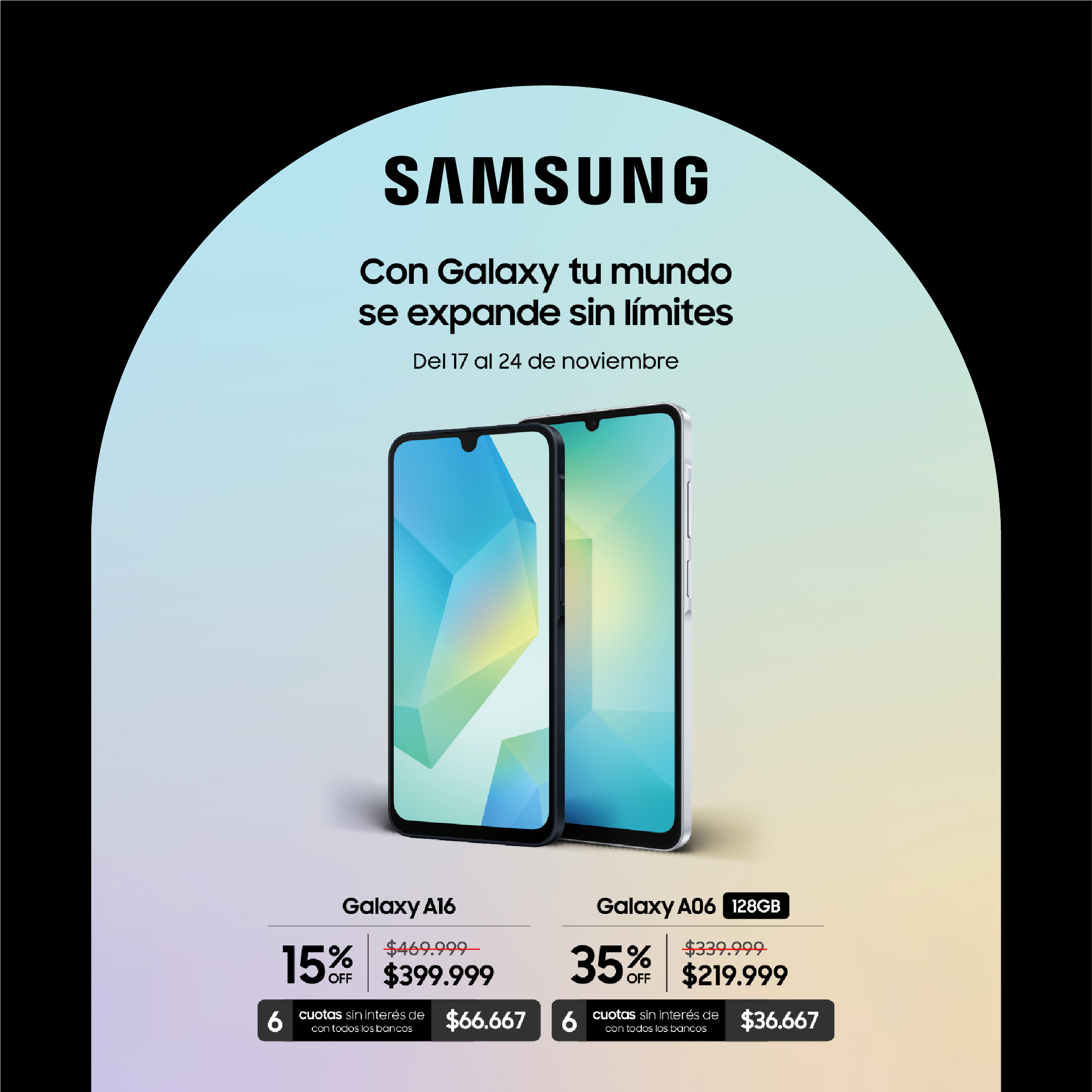 PROMOCIÓN VIGENTE DESDE EL 17/11/2025 AL 24/11/2025 O HASTA AGOTAR STOCK TOTAL DISPONIBLE EN LOS PUNTOS DE VENTA, LO QUE OCURRA PRIMERO. PROMOCIÓN VÁLIDA ÚNICAMENTE EN TIENDAS “SAMSUNG STORE”. HASTA 35% DE DESCUENTO EN CELULAR GALAXY A06 128GB (SKU SM-A065). HASTA 15% DE DESCUENTO EN CELULAR GALAXY A16 (SKU SM-A165). HASTA 20% DE DESCUENTO EN CELULAR GALAXY A26 (SKU SM-A265). 6 CUOTAS SIN INTERÉS ABONANDO LA TOTALIDAD DE LA COMPRA ÚNICAMENTE CON TARJETAS DE CRÉDITO VISA Y MASTERCARD EMITIDAS POR ENTIDADES BANCARIAS EXCLUSIVAMENTE EN LOS PRODUCTOS MENCIONADOS. COSTO FINANCIERO TOTAL (CFT): 0% - TASA EFECTIVA ANUAL (TEA): 0%. CONSULTE CON SU BANCO EMISOR LA EVENTUAL APLICACIÓN DE CARGOS Y/O SEGUROS ASOCIADOS A LA OPERATORIA EN CUOTAS. LAS COMPRAS EFECTUADAS EN CUOTAS ESTÁN SUJETAS AL LÍMITE DE CRÉDITO DISPONIBLE EN CADA TARJETA Y A LOS TÉRMINOS Y CONDICIONES DE LA ENTIDAD EMISORA. GMRA S.A., CUIT 30-71562186-6, RODNEY 70, CABA.
