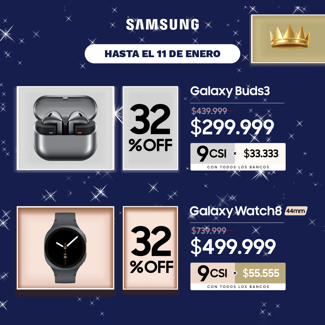 Promoción vigente desde el 2.1.2026 al 11.1.2026 o hasta agotar stock de equipos disponibles para esta promoción, lo que ocurra primero. Promoción válida únicamente en tiendas “Samsung Store”. Hasta 32% de descuento en Buds3 (SKU SM-R530) y Watch 8 44mm (SKU SM-L330). Hasta 9 cuotas sin interés con todos los bancos. Colores y stock sujetos a disponibilidad en la tienda al momento de realizar la compra. El consumidor deberá consultar previamente la disponibilidad en el punto de venta elegido. Para mayor información sobre los modelos de los productos y la financiación acercarse a cualquiera de las tiendas “Samsung Store”. No acumulable con otras promociones vigentes. Consulte con su banco emisor la eventual aplicación de cargos y/o seguros asociados a la operatoria en cuotas. Las compras efectuadas en cuotas están sujetas al límite de crédito disponible en cada tarjeta y a los términos y condiciones de la entidad emisora. GMRA S.A., CUIT 30-71562186-6, Rodney 70, CABA.