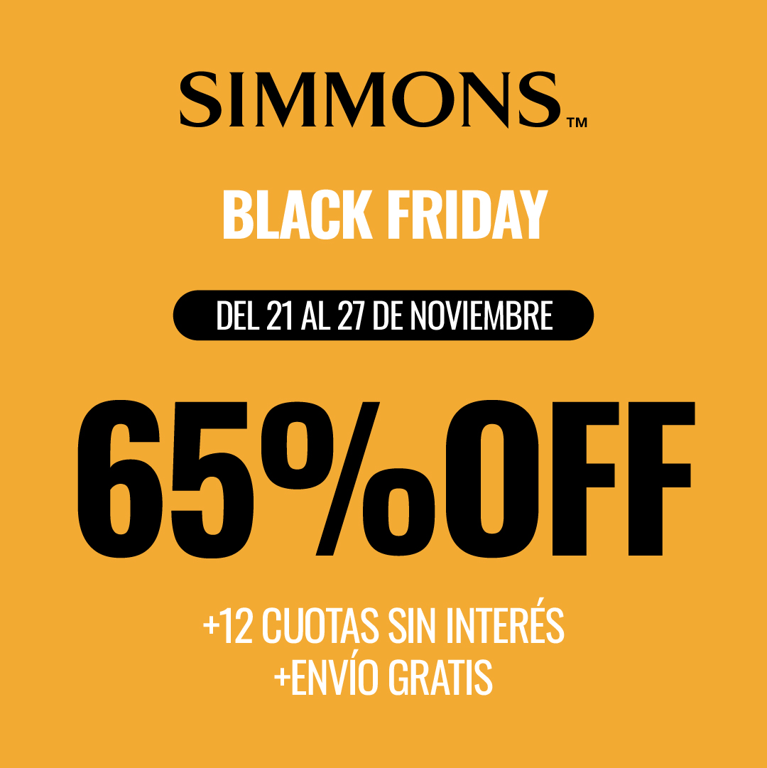 PROMOCIÓN VÁLIDA DEL 21/11/2025 AL 27/12/2025 EN EL SIMMONS STORE DE SOLEIL SHOPPING. SOBRE PRECIO DE LISTA 54,66%+30% DE DESCUENTO ACUMULADO EN CASCADA EN COLCHONES HOTEL BILT DESCUENTO FINAL 68,26% REPRESENTADO COMO 65% EN ESTÁ PIEZA. PARA PAGOS EN TARJETAS DE CRÉDITO HASTA EN 12 CUOTAS SIN INTERÉS. C.F.T.E.A A CARGO DEL CLIENTE: 0%. CONSULTE CON LA ENTIDAD BANCARIA EMISORA DE LAS TARJETAS DE CREDITO ADHERIDAS, LAS BASES Y CONDICIONES GENERALES, ACTUALES Y VIGENTES. NO ACUMULABLE CON OTRAS PROMOCIONES, REINTEGROS BANCARIOS O DESCUENTOS. EL COSTO DEL ENVÍO DENTRO DE UN RANGO DE DISTANCIA MENOR A 30 KM DEL LOCAL, SERÁ BONIFICADO EN LA VENTA MEDIANTE UN DESCUENTO DEL 99,99% SOBRE EL COD. FLETE ADMINISTRATIVO-GEN-GEN-SCF [000X000X01X00]. (EXCEPTO TIERRA DEL FUEGO). ORGANIZA. CUIT: 30-50062519-4. (IMAGEN A MODO ILUSTRATIVO).